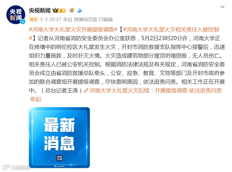 5月2日23时20分许,在修缮施工期间的河南大学河南留学欧美预备学校旧址大礼堂发现火情。经消防部门全力扑救,火灾被扑灭,无人员伤亡。据记载:大礼堂为全国重点文物保护单位。