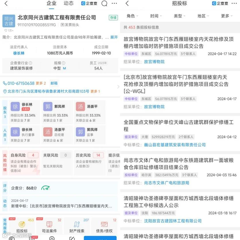 企查查信息显示,北京同兴成立于1999年,注册资金1080万元,法定代表人为徐长林。公开资料显示,先后中标全国多地文保单位修缮工程,其中包含大同代王府中轴前导区仿古建筑群油饰彩画工程、故宫博物院故宫的部分抢修和文物建筑保护修缮工程,全国重点文保单位天峰山古建筑群、原齐鲁大学近现代建筑群等。今年3月份,北京同兴成为清昭陵神功圣德碑亭屋面和方城西墙北段墙体修缮工程中标候选人。