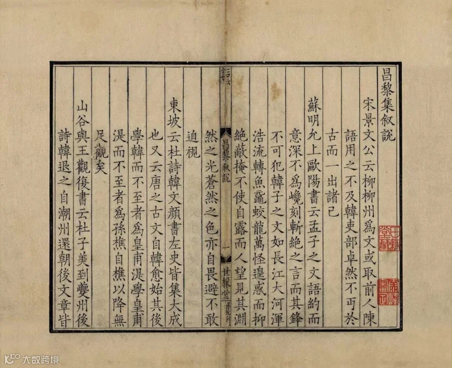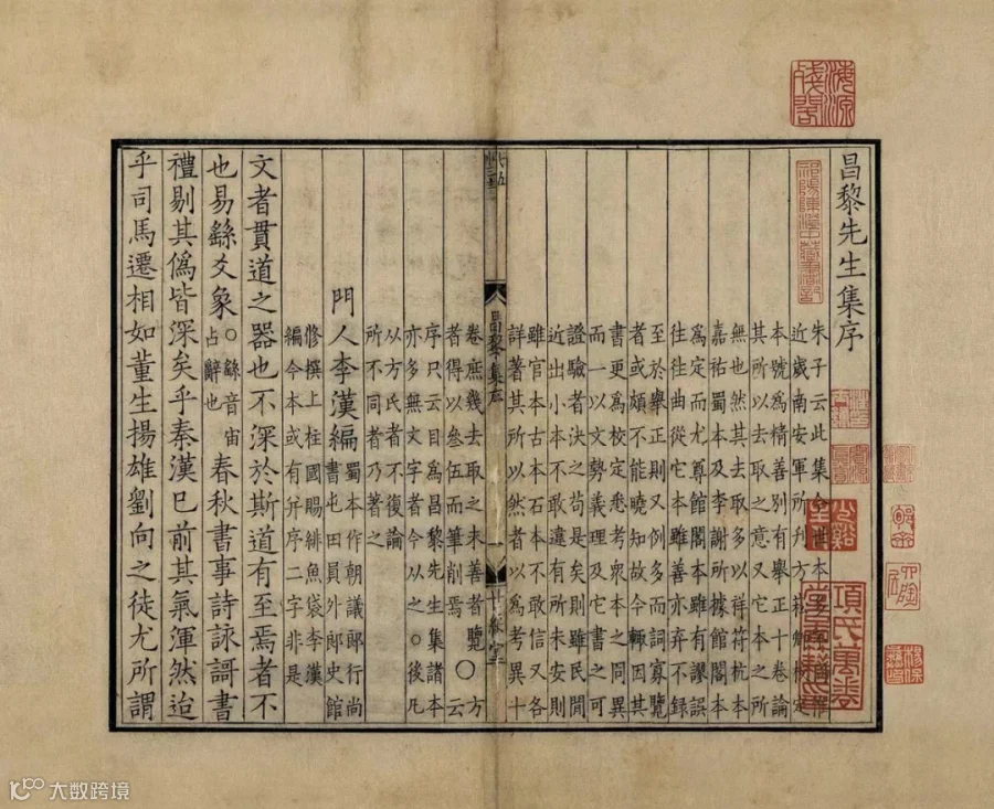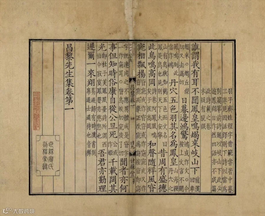 此宋咸淳廖氏世䌽堂刻本,廖莹中校正之《昌黎先生集》。廖莹中世䌽堂本在朱熹《考异》基础上,删取魏仲举《五百家注》中诸家要语,附注其下。收昌黎先生集四十卷、外集十卷、遗文一卷、朱子校昌黎先生集传一卷,半叶九行,行十七字,小字双行同,细黑口,四周双边。版心上镌字数,中镌“昌黎”及卷次、叶次,下镌“世䌽堂”及刻工。书首有李汉《昌黎先生集序》、《昌黎集叙说》、《重校昌黎集凡例》、《昌黎先生集目录》等,题“门人李汉编”;次《昌黎先生外集目录》、《昌黎先生集遗文目录》、《朱子编昌黎先生传目录》,全书三十二册。卷一至七赋、古诗,卷八联句,卷九至十律诗,卷十一至十四杂著,卷十四至十九书,卷十九至二十一序,卷二十二至二十三祭文,卷二十四至三十五碑志,卷三十六杂文,卷三十七至四十表状。《外集》卷一至五为诗、书、序、祭文等,卷六至十为《顺宗实录》。《遗文》 为遗诗、杂文等。目录后及各卷末有长方、椭圆、亚字形“世䌽廖氏刻梓家塾”牌记。