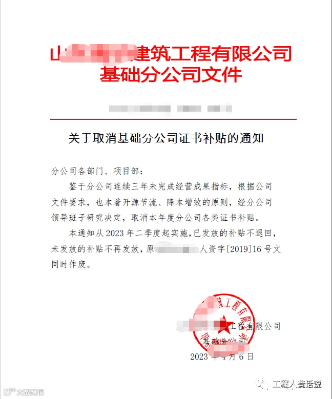 其实早在4月6日,山西某建筑公司也取消了证书补贴的通知。根据分公司连续三年未完成指标,公司也开源节流,取消本年度分公司各类证书补贴。
