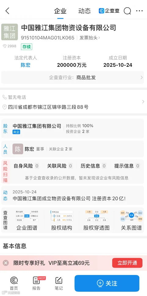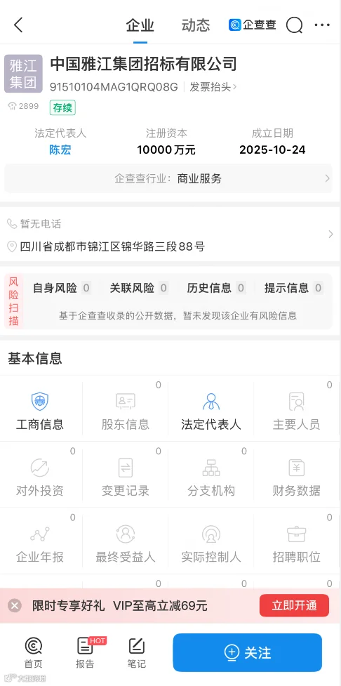 据工商注册信息显示,10月22日,中国雅江集团有限公司成都分公司注册成立,注册地址位于成都市锦江区锦江大道1666号;10月24日,中国雅江集团物资设备有限公司、中国雅江集团招标有限公司注册成立,注册地址均位于成都市锦江区锦华路三段88号。
