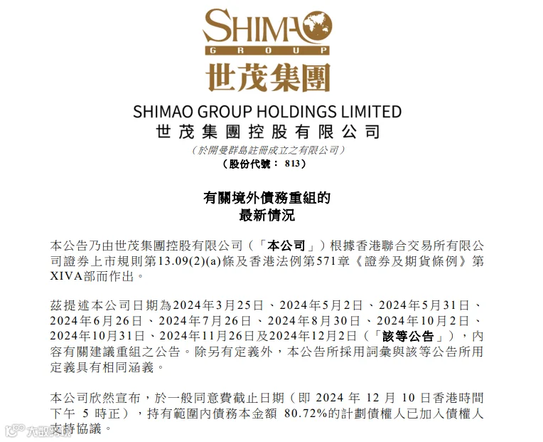 12月17日,宝龙地产发布公告称,公司有关债务重组计划呈请在12月17日所有计划条件已达成,并于当日开始落实。同一天,世茂集团也公布了最新的债务重组进展,债务本金额80.72%的计划债权人已加入债权人支持协议。