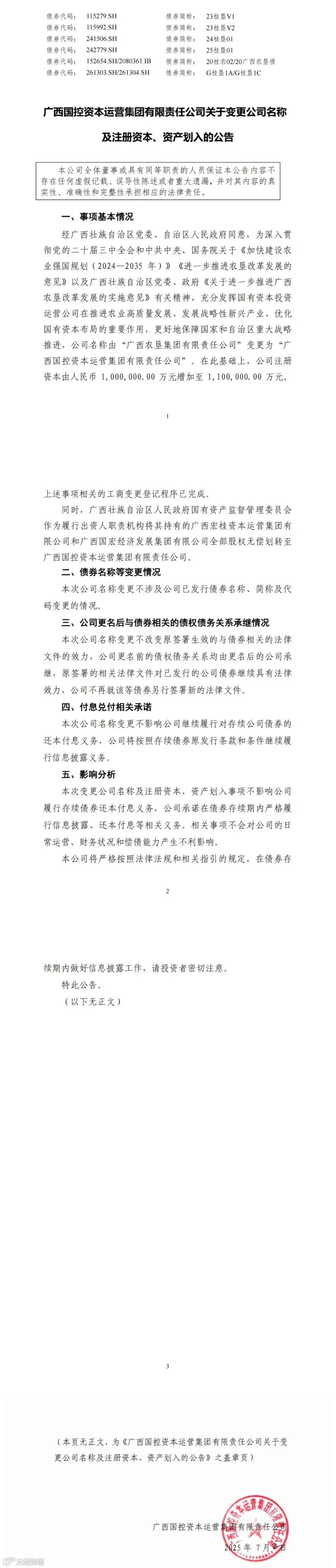 7月2日,广西国控发布公告变更公司名称、注册资本、资产划入。公司名称由“广西农垦集团有限责任公司”变更为“广西国控资本运营集团有限责任公司”,注册资本由人民币100亿元增加至110亿元。