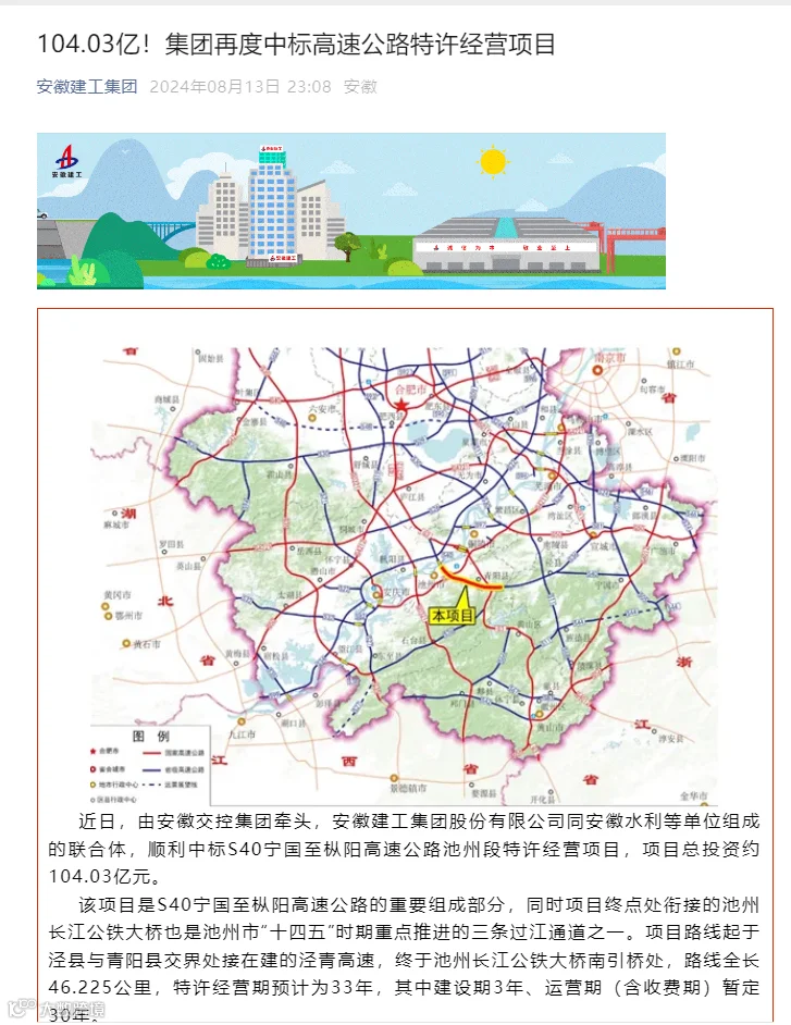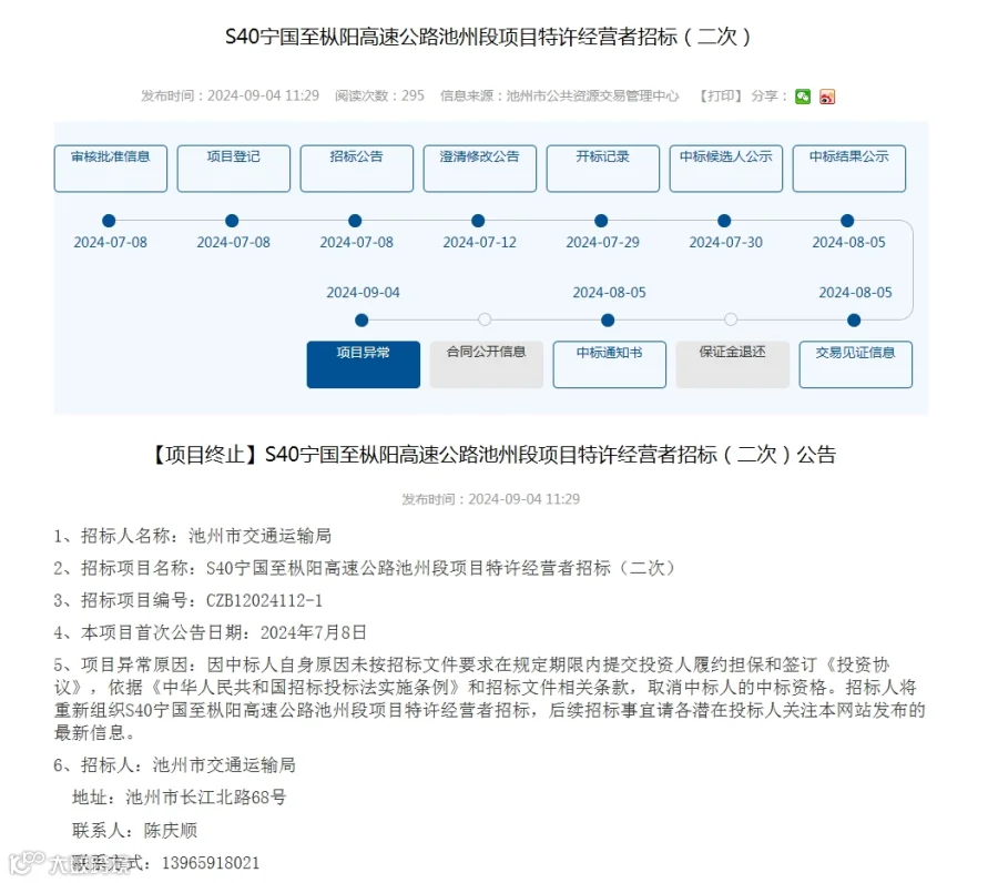 近日,池州市公共资源交易管理中心发布了关于S40宁国至枞阳高速公路池州段项目特许经营者招标(二次)项目的终止公告。为什么是二次,因为第一次是因为投标人不足三家流标了。第二次,又因为该项目的中标人因自身原因未能在规定期限内提交投资人履约担保和签订《投资协议》,导致其中标资格被取消。这个项目可真是命途多舛啊。