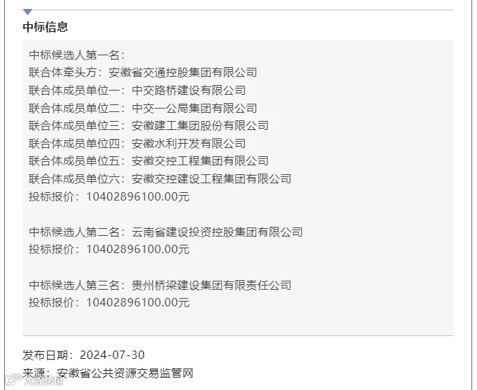 从上面可以看到,以安徽省交通控股集团有限公司为牵头方,中交路桥建设有限公司、中交一公局集团有限公司、安徽建工集团股份有限公司、安徽水利开发有限公司、安徽交控工程集团有限公司、安徽交控建设工程集团有限公司等为联合体的中标人因自身原因未能在规定期限内提交投资人履约担保和签订《投资协议》,导致其中标资格被取消。
