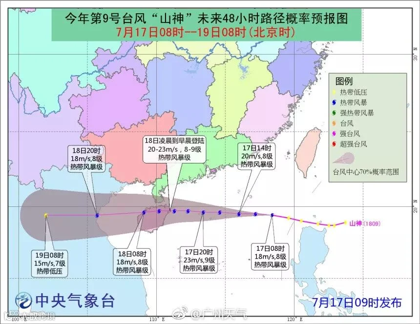 预计,“山神”将于18日早晨到上午在雷州到海南陵水之间沿海地区登陆。受其影响,17到18日,我市将有大到暴雨、局部大暴雨,沿海海面风力将逐渐加强到7到9级、阵风10到11级,请迅速做好防御准备工作。