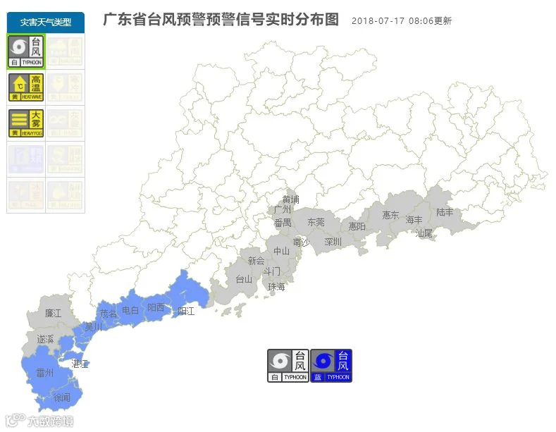 17日(今日),粤西市县有大雨到暴雨局部大暴雨,珠江三角洲南部市县有(雷)阵雨,其余市县多云局部有阵雨;