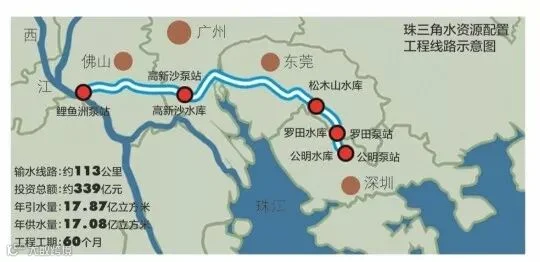 据国家发改委批文显示,珠三角水资源配置工程由一条干线、两条分干线、一条支线、三座泵站和一座新建调蓄水库组成。工程西起西江干流鲤鱼洲,东至深圳公明水库,以深层管道输水方式穿越珠三角核心城市群。