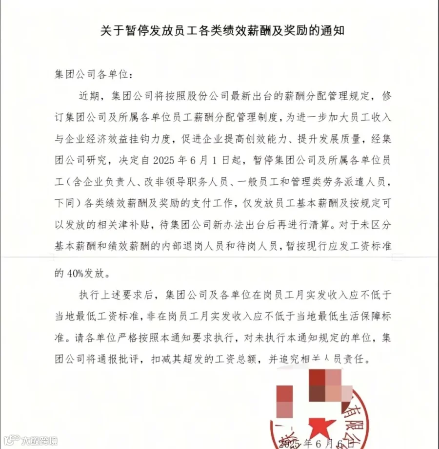 近期,集团公司将按照股份公司最新出台的薪酬分配管理规定,修订集团公司及所属各单位员工薪酬分配管理制度,为进一步加大员工收入与企业经济效益挂钩力度,促进企业提高创效能力、提升发展质量,经集团公司研究,决定自2025年6月1日起,暂停集团公司及所属各单位员工(含企业负责人、改非领导职务人员、一般员工和管理类劳务派遣人员,下同)各类绩效薪酬及奖励的支付工作,仅发放员工基本薪酬及按规定可以发放的相关津补贴,待集团公司新办法出台后再进行清算。对于未区分基本薪酬和绩效薪酬的内部退岗人员和待岗人员,暂按现行应发工资标准的40%发放。