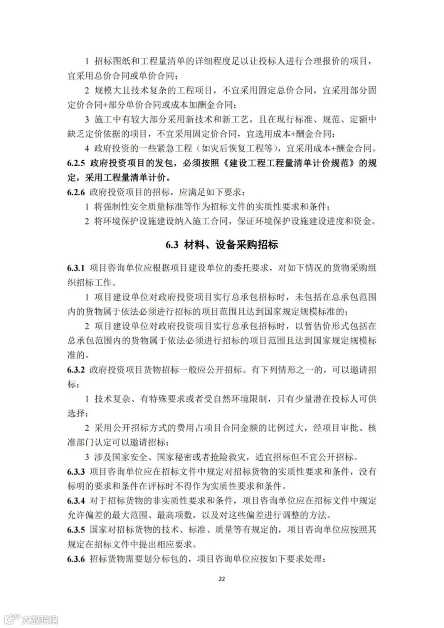 6.2.6 政府投资项目的招标,应满足如下要求:1 将强制性安全质量标准等作为招标文件的实质性要求和条件;2 将环境保护设施建设纳入施工合同,保证环境保护设施建设进度和资金。