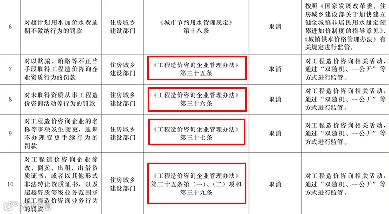 其中已取消的《工程造价咨询企业管理办法》条款如下: