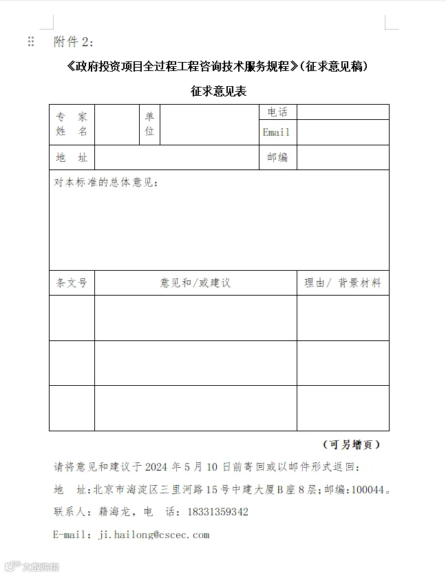 2. 《政府投资项目全过程工程咨询技术服务规程(征求意见稿)》征求意见表.docx