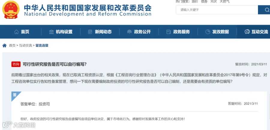 对此,发改委投资司回复:政府投资的可行性研究报告由谁编写由项目单位决定,属于市场化行为。