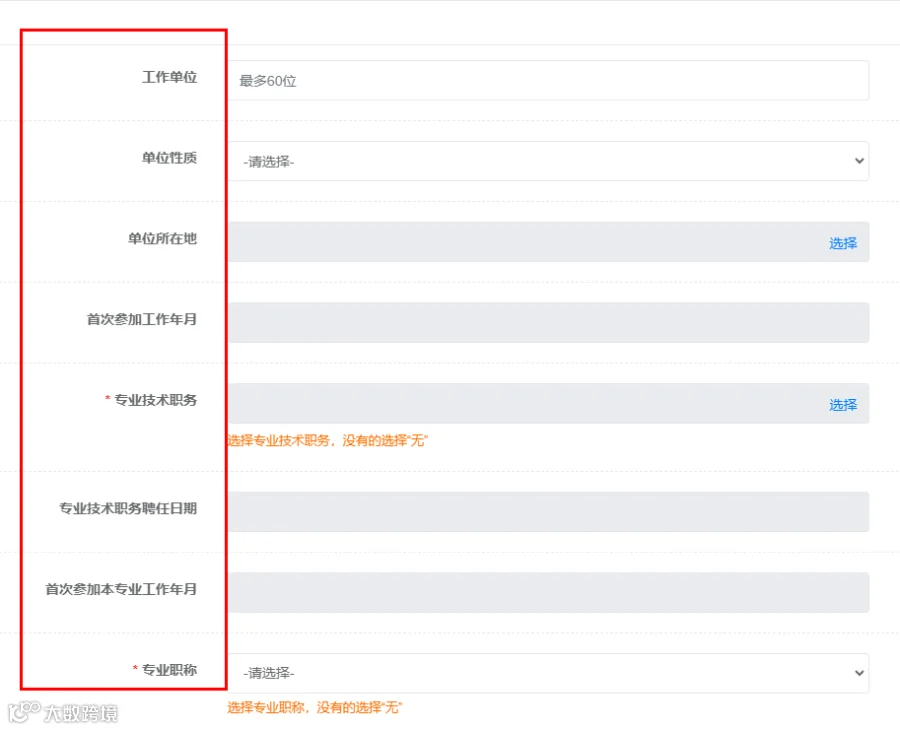 需要填写的信息包括工作单位、单位性质、单位所在地、首次参加工作年月、专业技术职务、专业技术职务聘任日期、首次参加本专业年月、专业职称等。