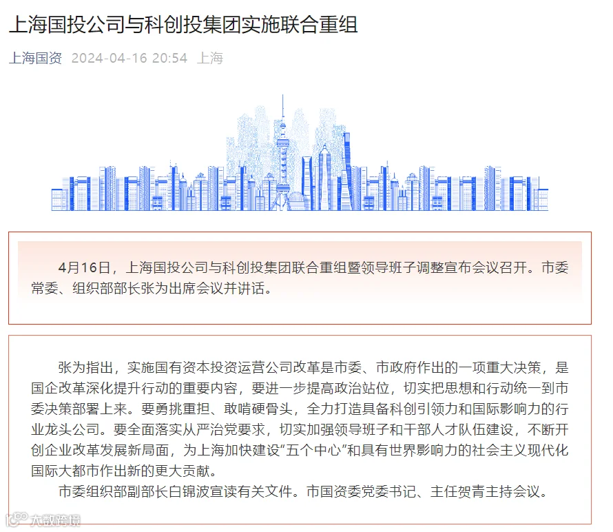 另据证券时报消息:科创投集团依然保留,由原来的上海市属国资一级公司变为二级公司。
