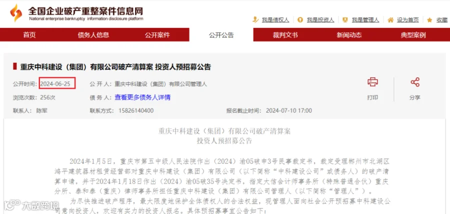2024年6月25日重庆中科建设集团有限公司破产清算案投资人预招募公告: