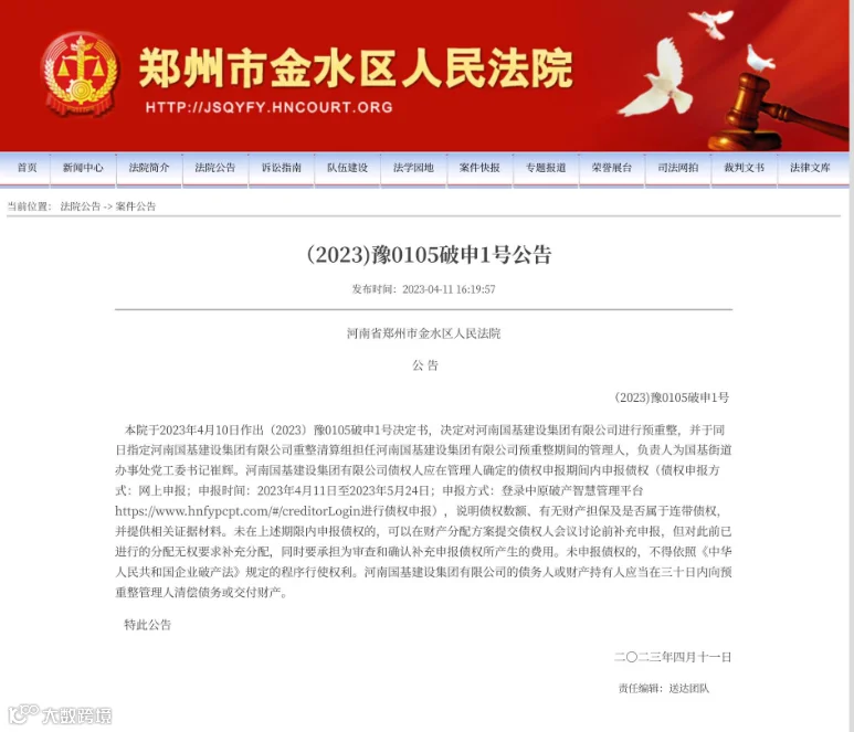2024年1月,河南省国基建设集团有限公司(房建、市政特级)进入破产重整。
