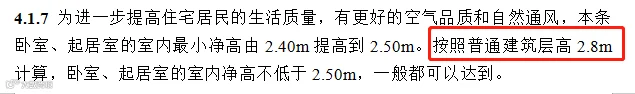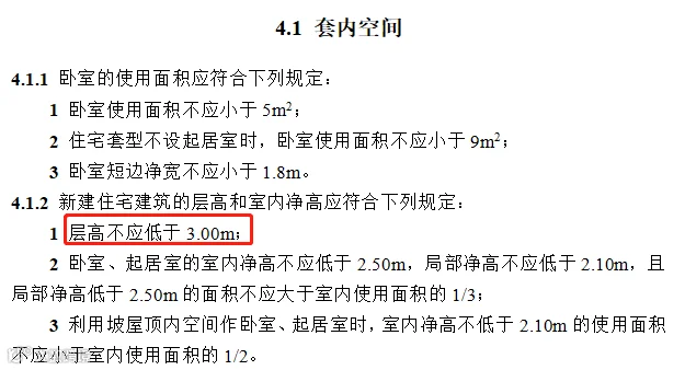 4.2.1 住宅层高不应低于3.00m。设有户式中央空调和集中新风系统的住宅,层高不应低于3.10m。有条件的项目适度加大空间高度,提高至3.30m以上。
