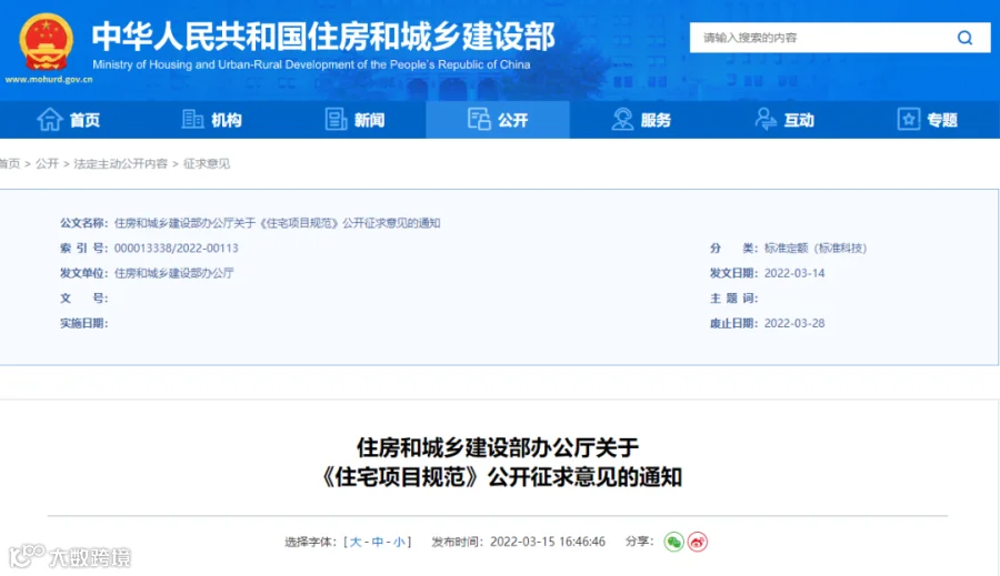2022年3月,住建部发布关于《住宅项目规范》公开征求意见的通知,《住宅项目规范》已起草完成,在前期多次征求意见基础上修改完善并经专家审查通过。现再次向社会公开征求意见。