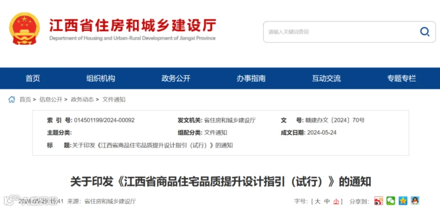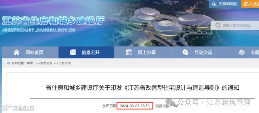 2024年3月5日,江苏省住建厅发布关于印发《江苏省改善型住宅设计与建造导则》的通知。