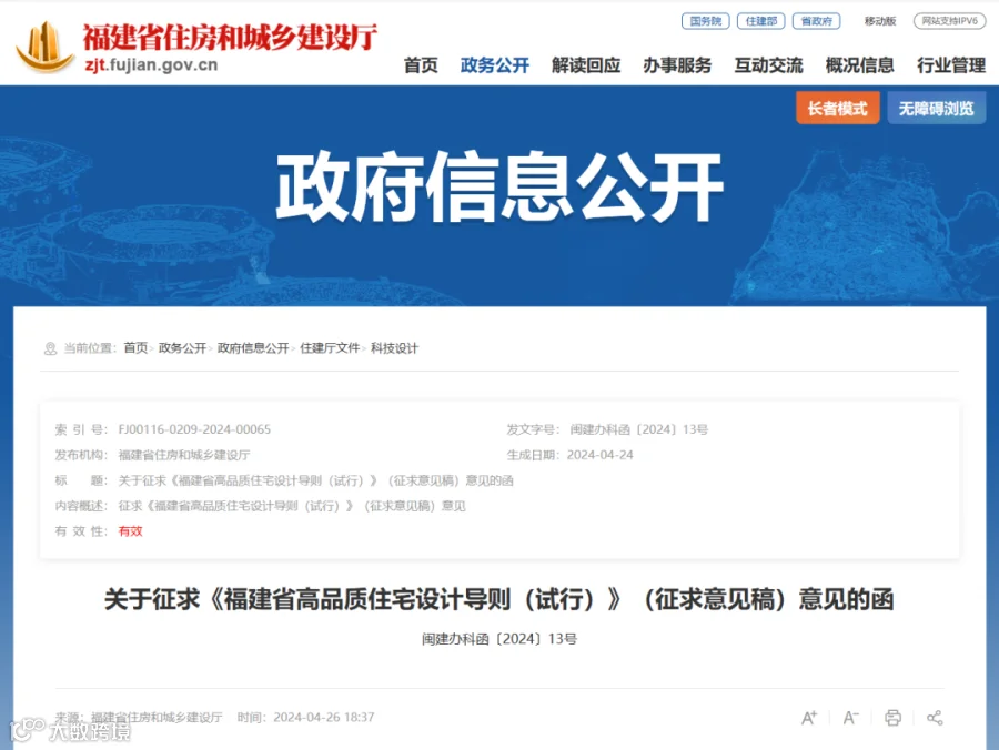 4月26日,福建省住建厅发布关于征求《福建省高品质住宅设计导则(试行)》(征求意见稿)意见的函(闽建办科函〔2024〕13号)。