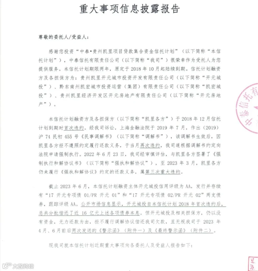 2023年7月28日,中泰信托发布“贵州凯里项目贷款集合资金信托计划重大事项信息披露报告”。报告显示,截至本信息披露报告发出前,融资方和相关担保方仍以没有资金,无力偿还为由拒绝还款,最终前述催收措施均无结果。