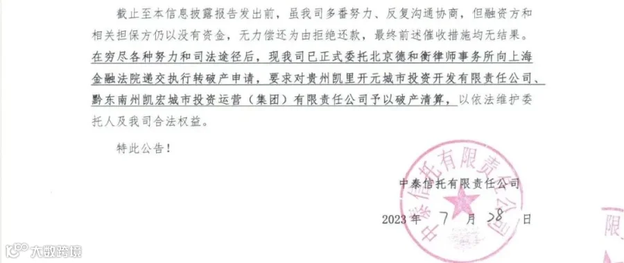 2023年,中泰信托向上海金融法院递交执行转破产申请,要求对贵州凯里开元城市投资、黔东南州凯宏城投予以破产清算。