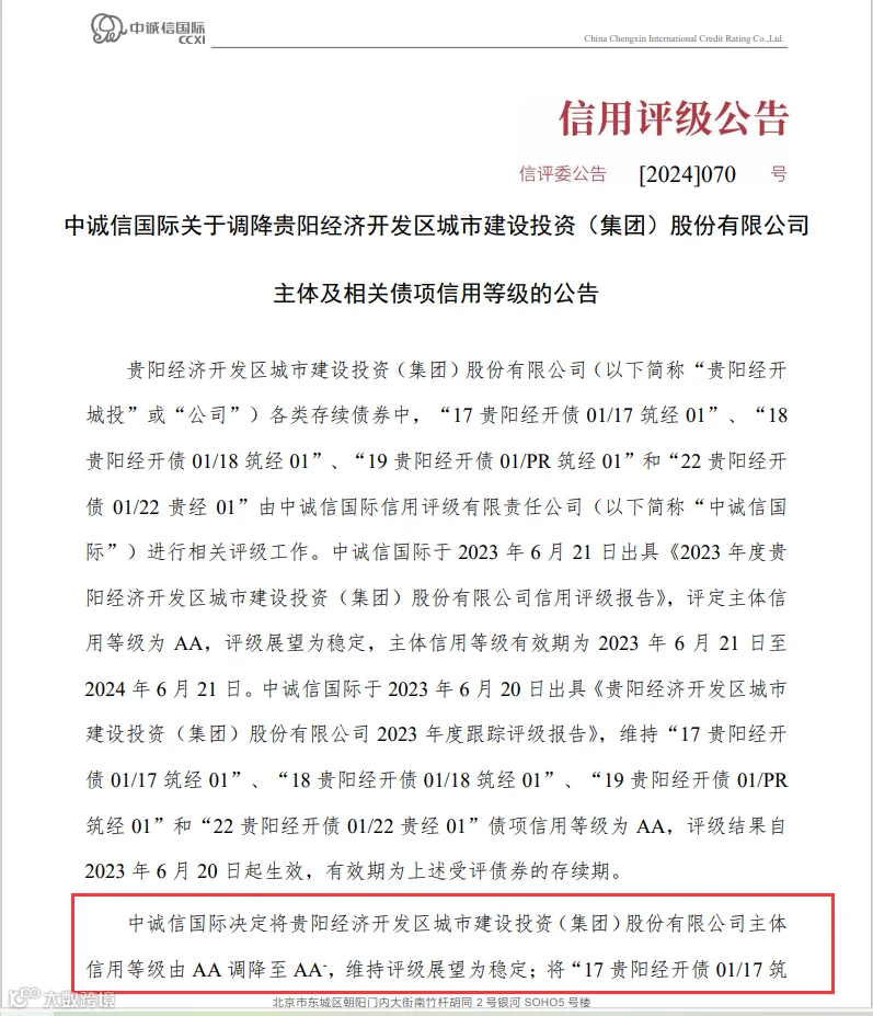 2月2日,中诚信国际公告称,将贵阳经济开发区城市建设投资(集团)股份有限公司(以下简称“贵阳经开城投”)主体信用等级由AA调降至AA-,维持评级展望为稳定。同时,中诚信国际将相关债项信用等级由AA调降至AA-。