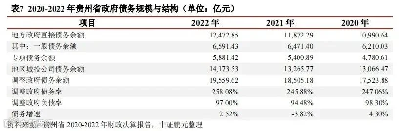根据贵州财政厅数据及贵州地方政府再融资一般债券(七期)信用评级报告,截至2022年底,贵州政府债务余额约12470亿元,位于财政部核定的限额(12962亿元)之内。截至2023年底,全省政府债务余额约15125亿元,控制在限额之内(16171.55亿元)。贵州2023年债务余额占地区生产总值比重(债务率)约为72%,这超过了60%警戒线。