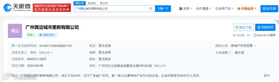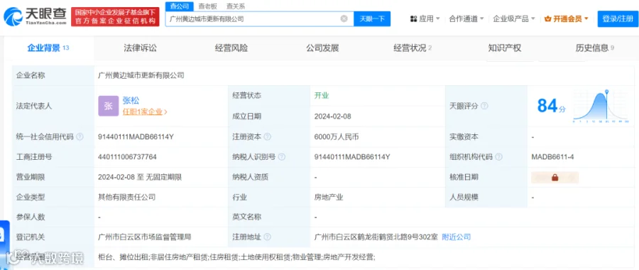国家企业信用信息公示系统显示,广州黄边城市更新有限公司法定代表人张松,成立日期2024年2月8日,经营范围是柜台、摊位出租;非居住房地产租赁;住房租赁;土地使用权租赁;物业管理;房地产开发经营。