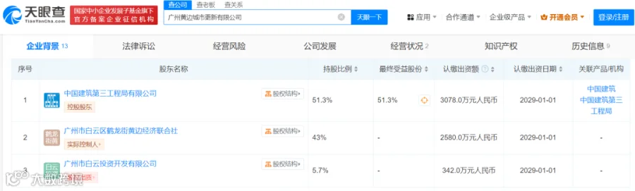 公开资料显示,广州黄边城市更新有限公司实际控制人为广州市白云区鹤龙街黄边经济联合社,控股43%,控股股东为中国建筑第三工程局有限公司,控股51.3%,广州市白云投资开发有限公司,控股5.7%。