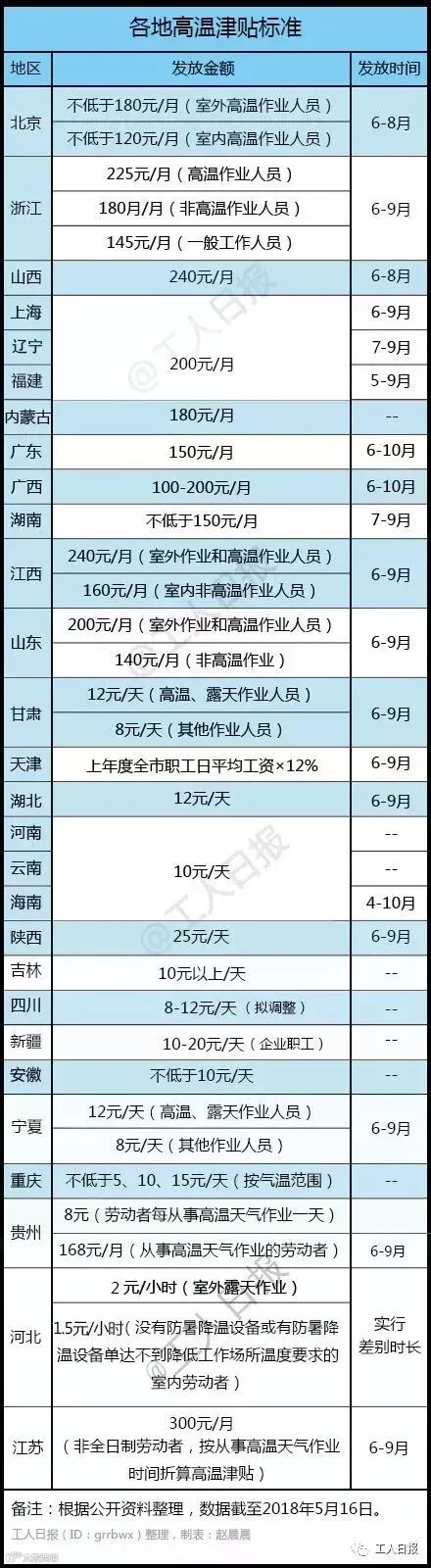 从2018年6月起,很多地区都将持续发放高温津贴。每年6月至10月,劳动者从事露天岗位工作以及用人单位不能采取有效措施将作业场所温度降低到33℃以下的(不含33℃),用人单位应当按月向劳动者发放高温津贴。