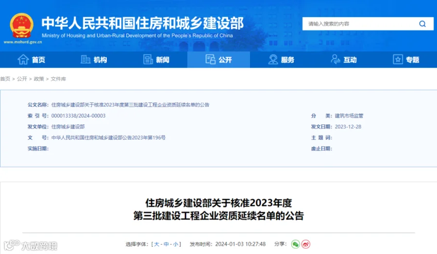 刚刚,住建部发布《关于核准2023年度第十三批建设工程企业资质名单的公告》和《关于核准2023年度第三批建设工程企业资质延续名单的公告》。