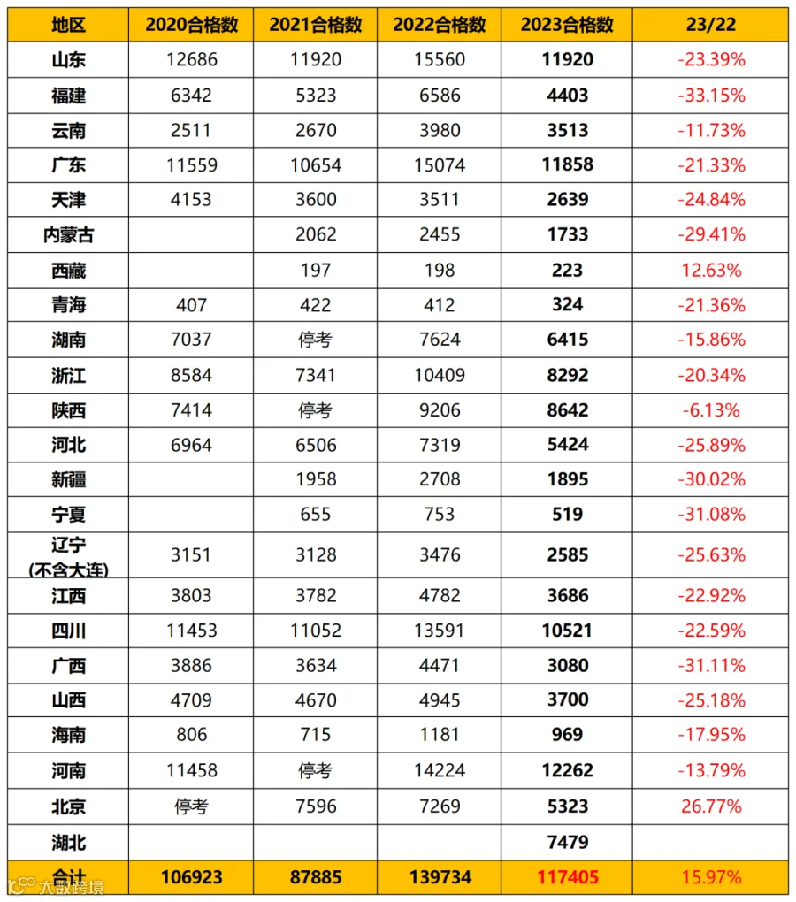 今年通过人数暴降,截至目前,降的最多的是福建(-33.2%),考试大省山东、广东、四川也有百分之二十多的下降。