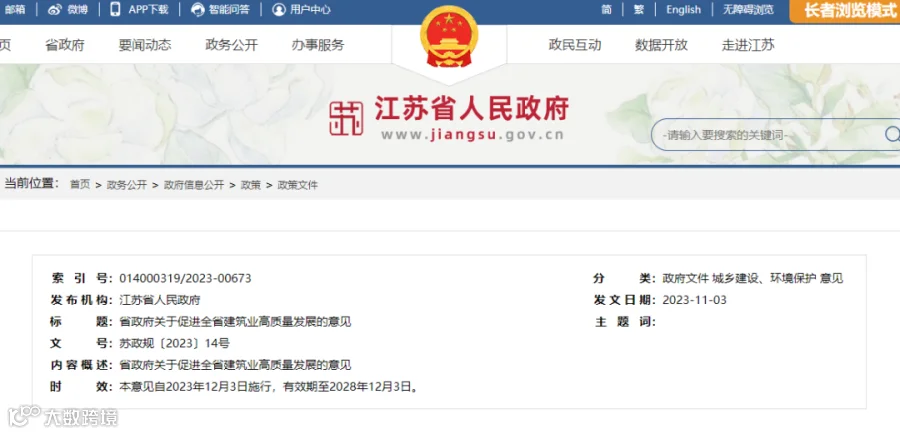 2023年11月3日,江苏省政府印发《关于促进全省建筑业高质量发展的意见》(苏政规〔2023〕14号),本意见自2023年12月3日施行,有效期至2028年12月3日。