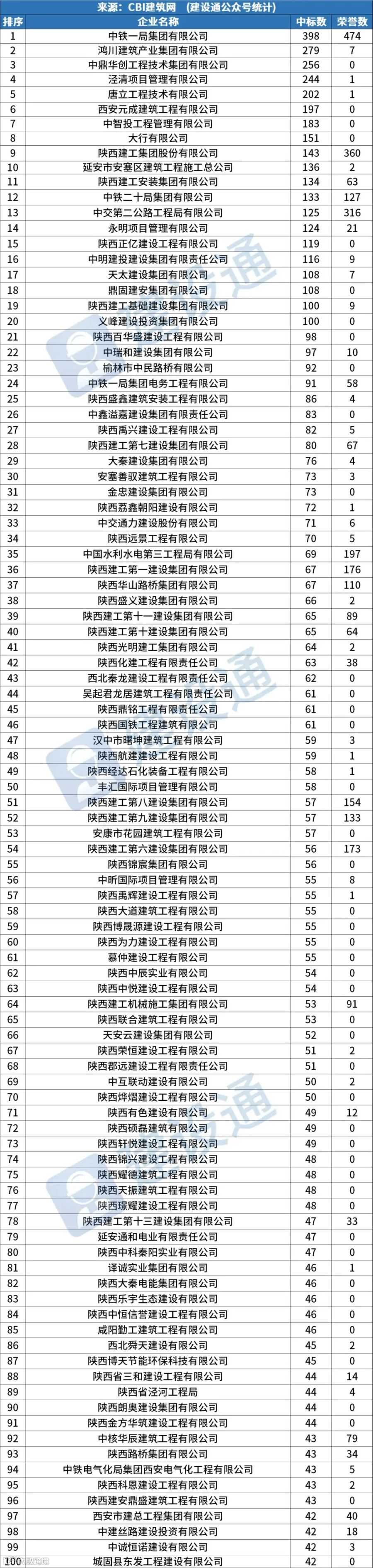 CBI建筑网综合报道:在2023年,陕西建筑施工企业中标数量达67170项,同比(与去年同期)上升17.04%。其中,中铁一局集团有限公司、鸿川建筑产业集团有限公司、中鼎华创工程技术集团有限公司分列中标数量排行榜前三位。