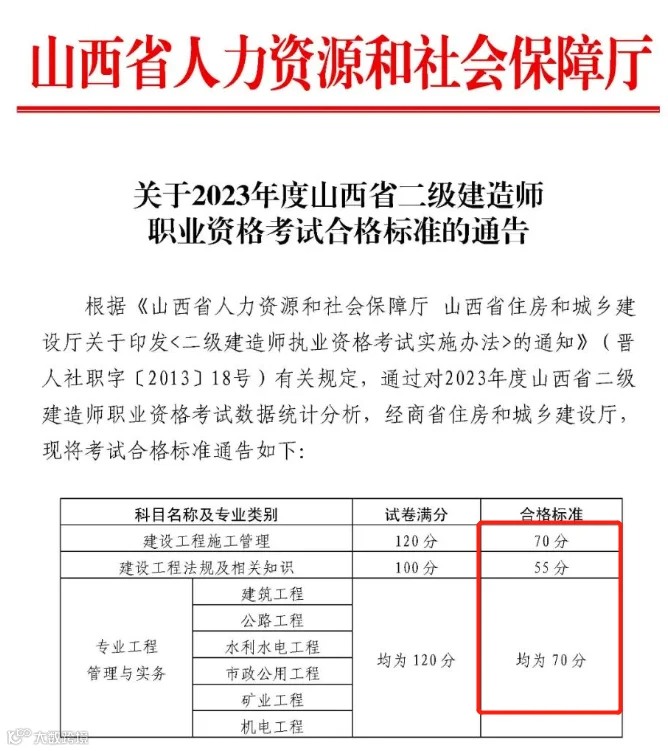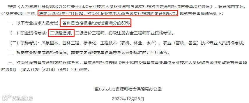 重庆市人社局去年年底发文:自2023年1月1日起,二建实行相对固定合格标准,各科目合格标准均为试卷满分的60%。