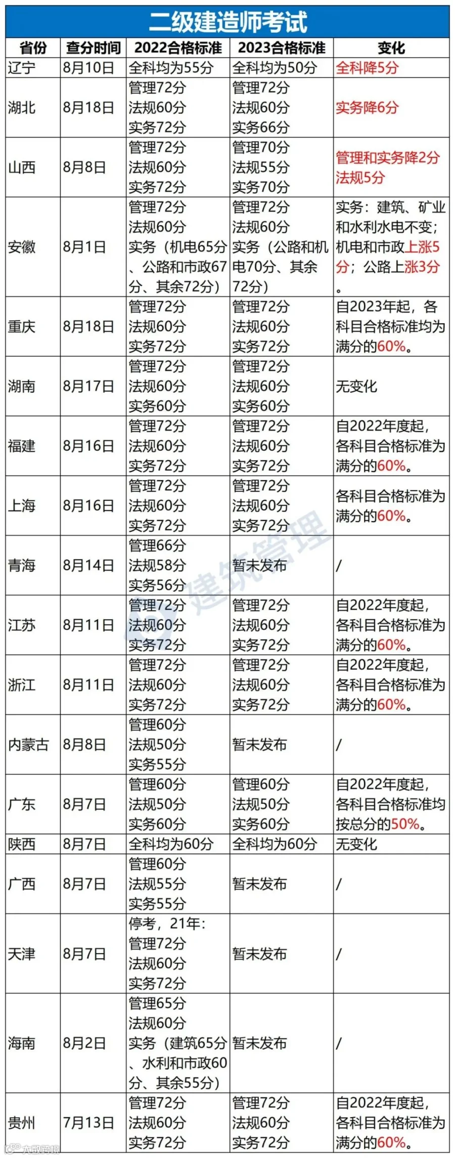 近日,各地都陆续公布了2023年二建成绩和合格标准。其中变化比较大的几个省份: