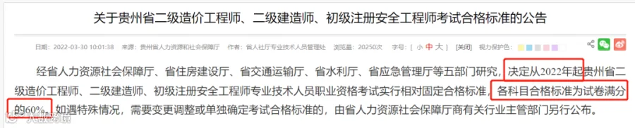 贵州人社厅发文《关于贵州省二级造价工程师、二级建造师、初级注册安全工程师考试合格标准的公告》:决定从2022年起贵州省二级建造师考试实行相对固定合格标准,各科目合格标准为试卷满分的60%,如遇特殊情况,另行通知。