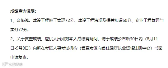 2.关于复查成绩。应试人员如对本人成绩有疑问,请于成绩公布后30日内(8月11日-9月8日)向所在考区人事考试机构(省直考区向省住建厅执业资格注册中心)书面申请复查。