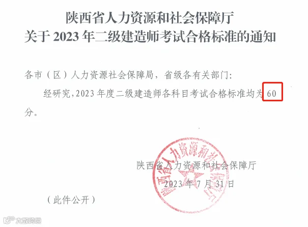 陕西2023二建合格标准均为60分,近5年来均相同。