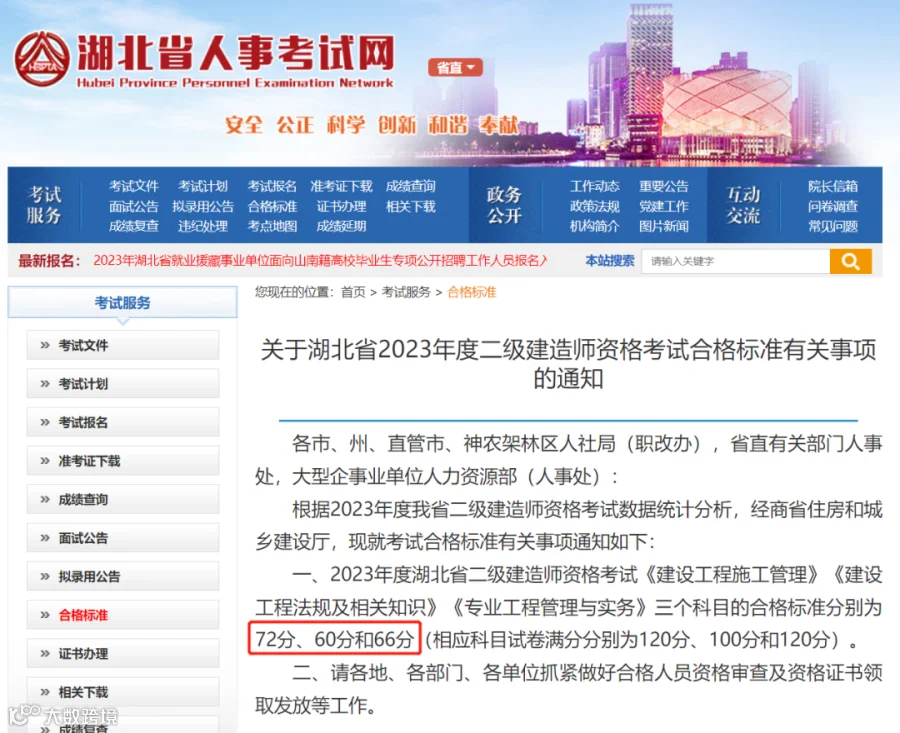 湖北省二建合格标准实务66分,比去年降了6分。