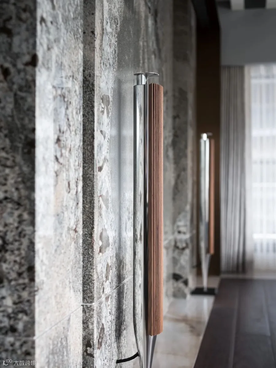电视墙选用大面积的花岗岩,凝结自然高温高压之力而形成的纹路,保有大自然稳定的力量,创造出静默的美感。因男主人对音响的讲究,特意与丹麦顶级音响品牌B&O订制红木为材质的扬声器,呼应整体空间使用的材质。