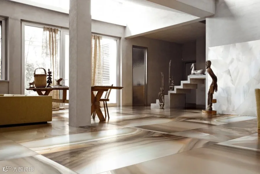 本案餐厅地面以DPI进口瓷砖·REX汉妮玉深啡为主选材,如天空云彩般变幻的纹理,为空间增添了灵动与柔美、诗意与浪漫的色彩,自然的美感融合天然玉石逷透温润的质感,也让空间变得温馨而奢华。