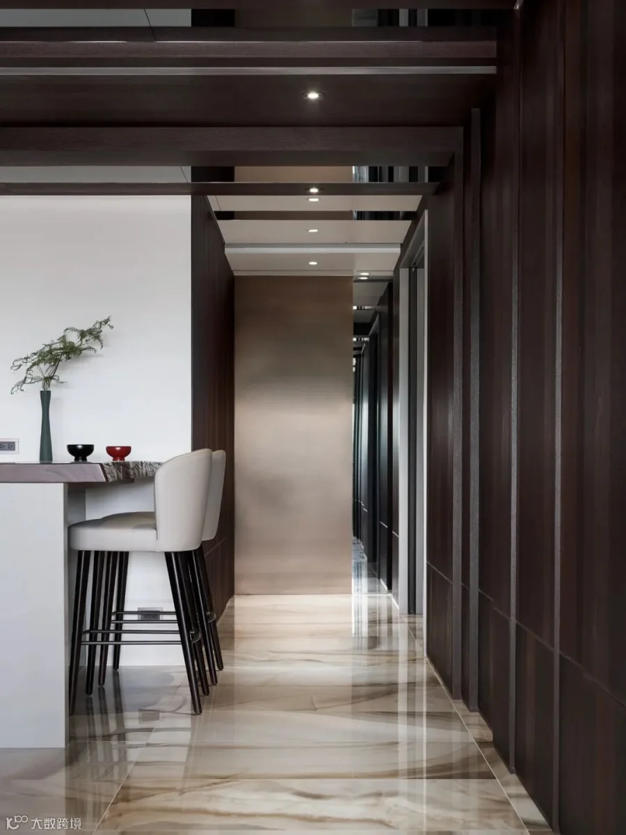 轻食、热炒区专用的厨房与餐厅位于同一条轴线,与客餐厅轴线形成X与Y轴,完整的动线设计提供社交活动更便利、友善的布局。以「框」作为区隔,红木、镜面错落有序的包覆,成为厨房与客餐厅的分隔,让人的感知自然而然知晓使用区域的转换,为整个家增加了一丝沉静与温厚。