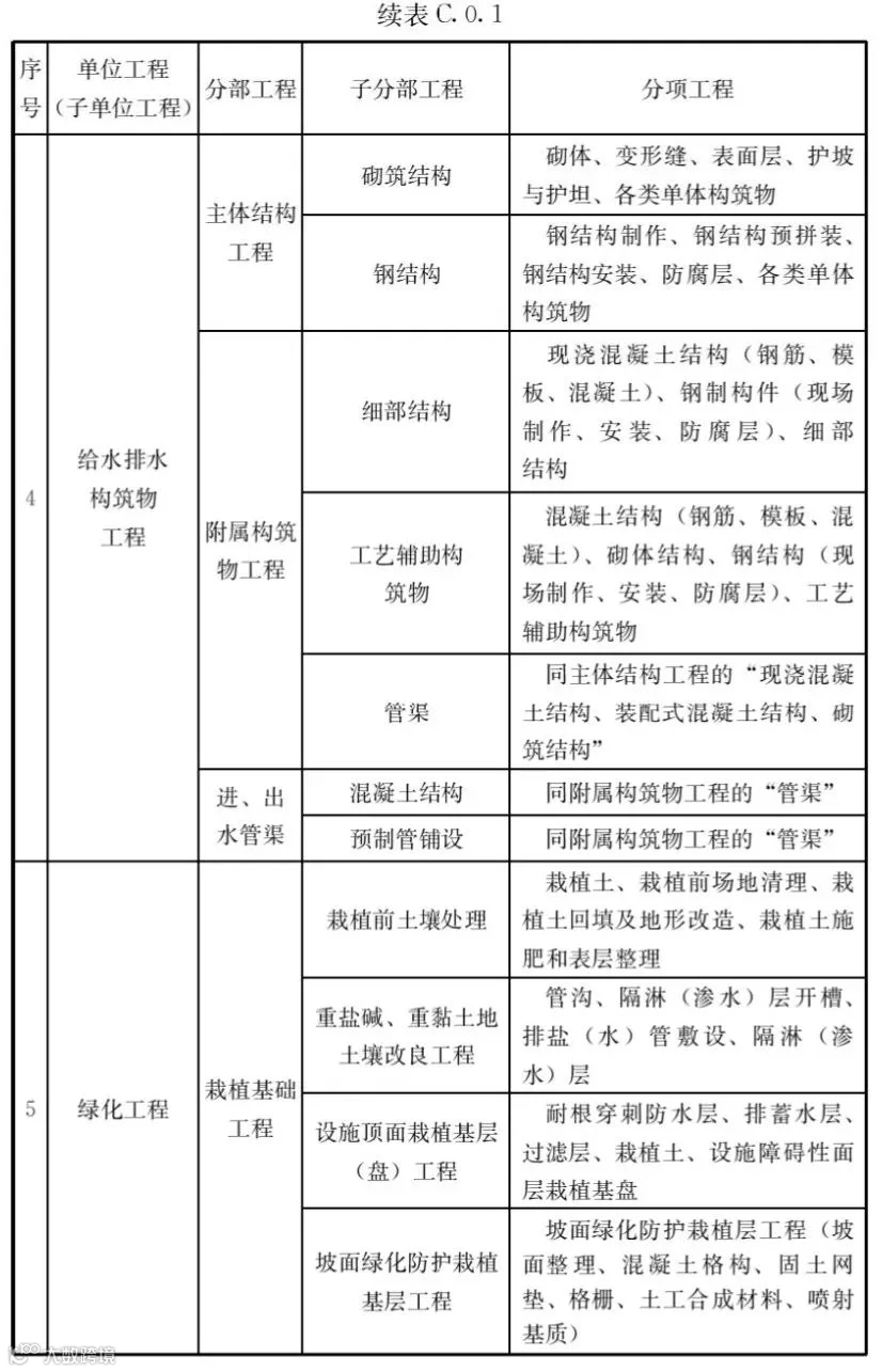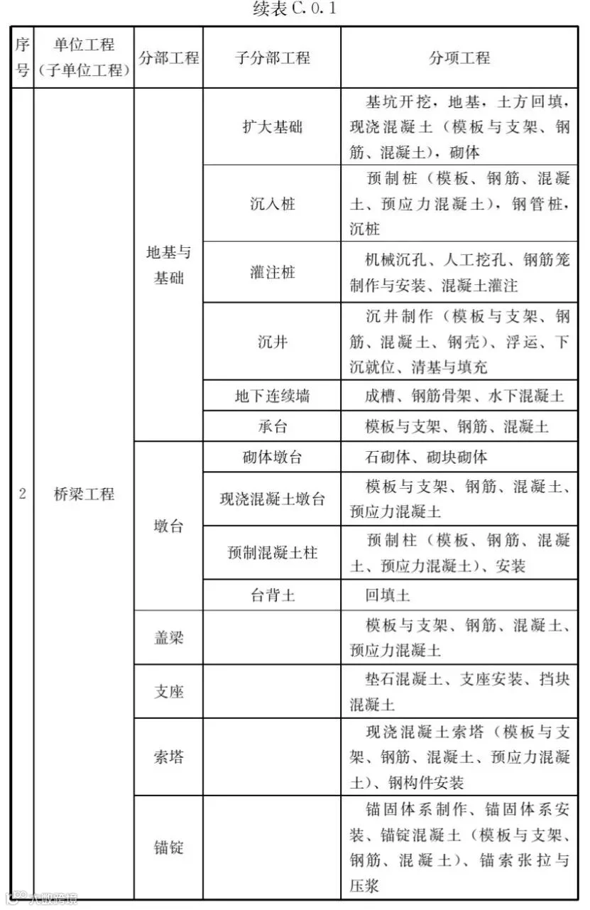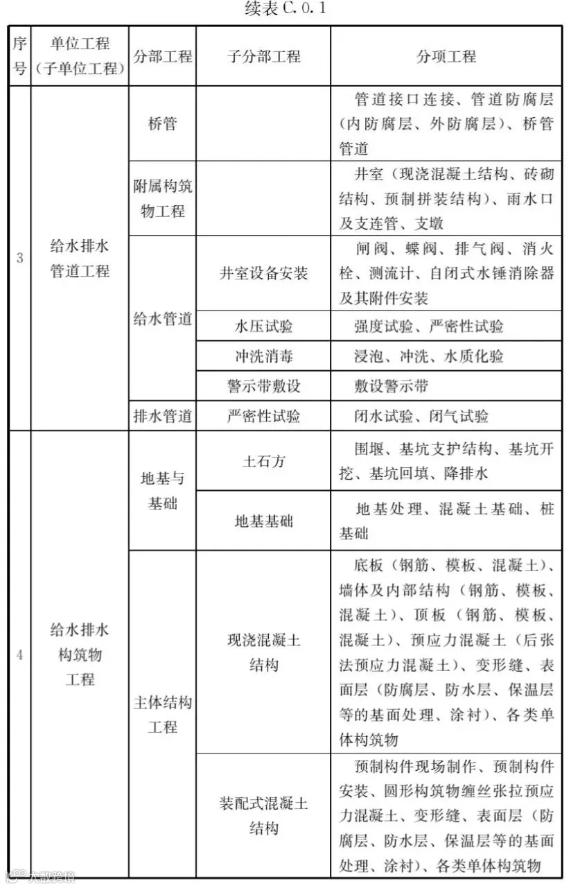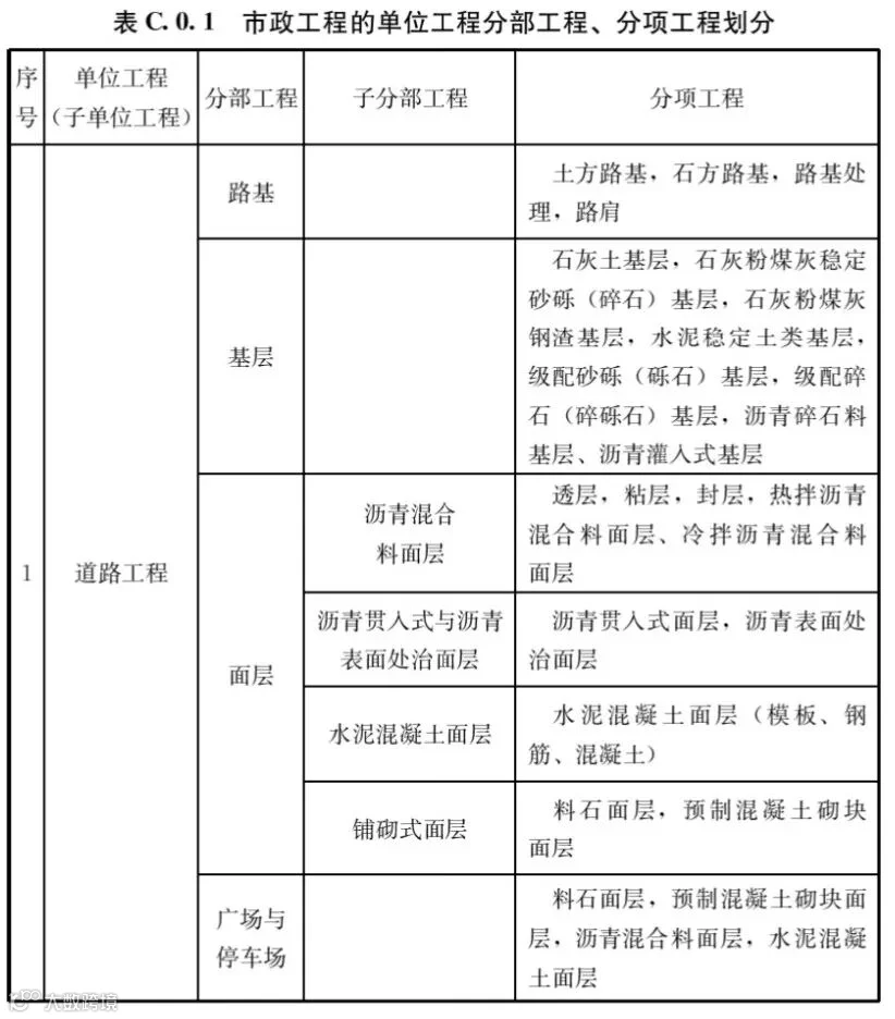 C.0.1市政工程的单位工程、分部工程、分项工程划分应符合表C.0.1的规定。