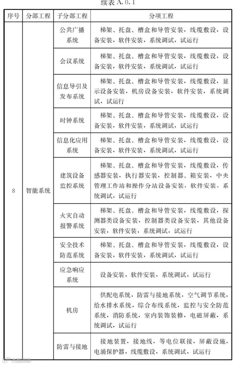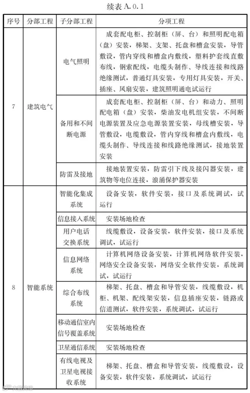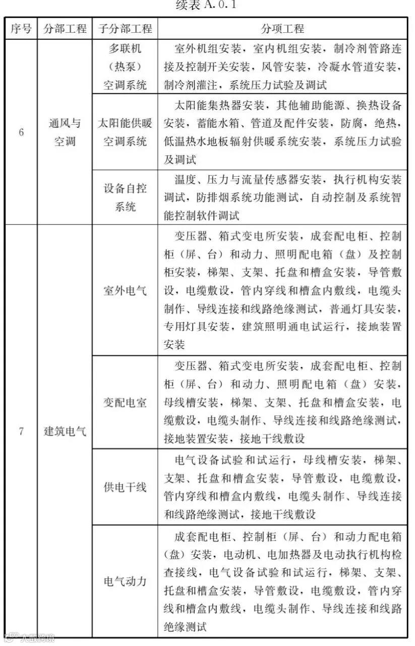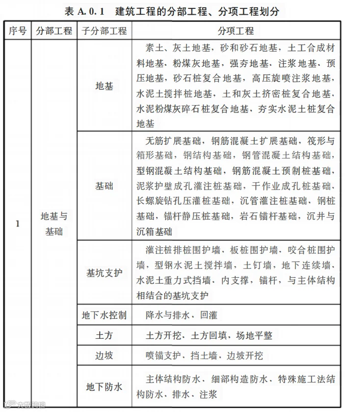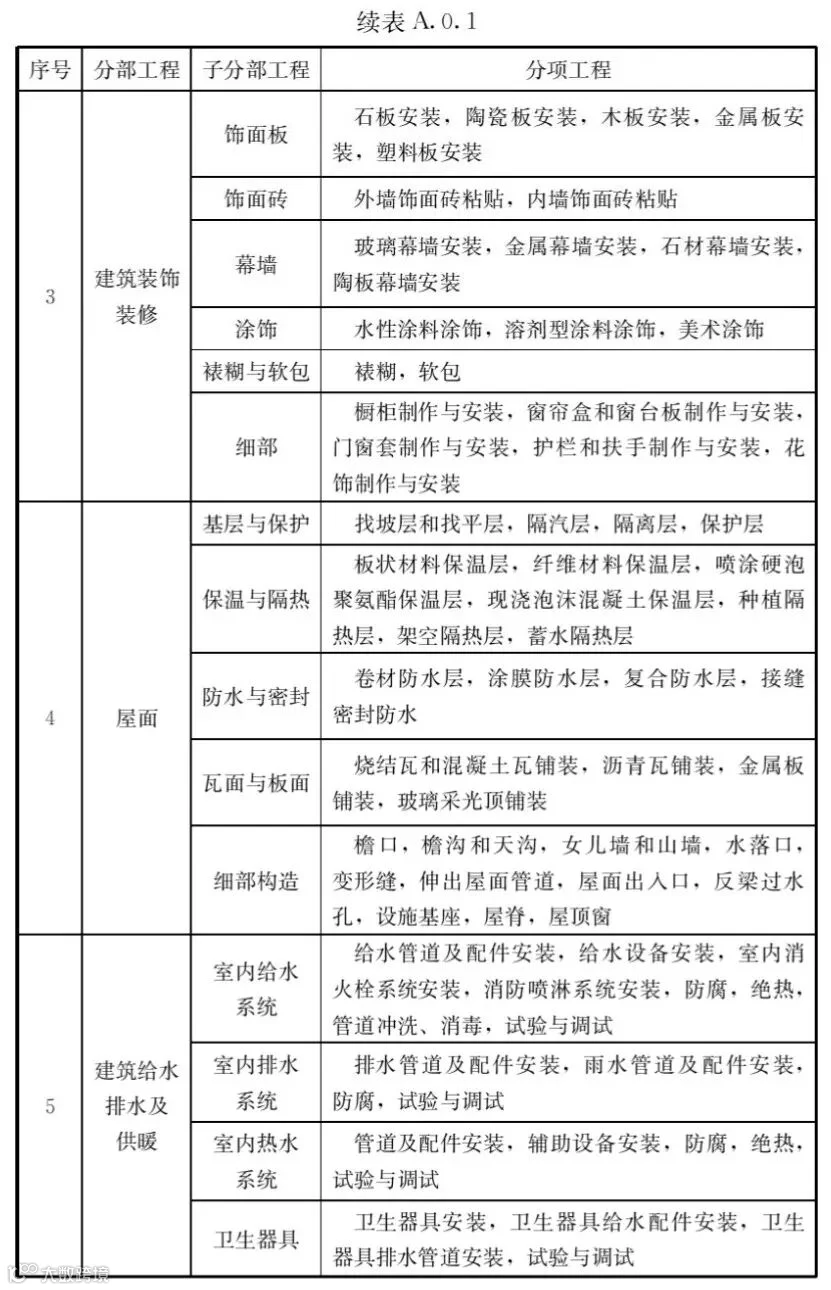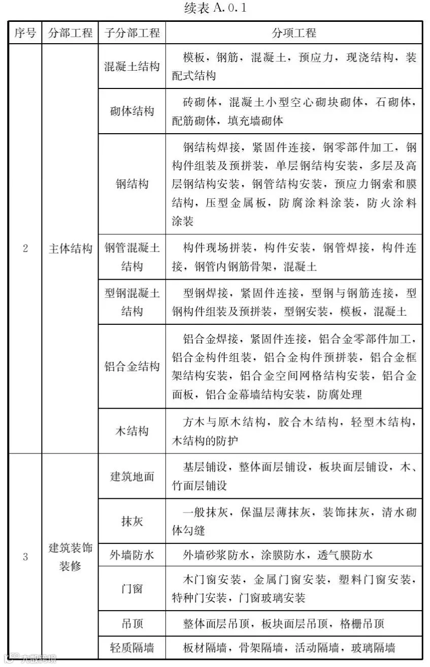 A.0.1建筑工程的分部工程、分项工程划分应符合表A.0.1的规定。