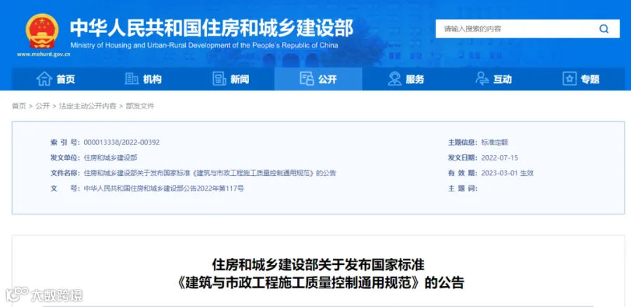 住建部发布国家标准《建筑与市政工程施工质量控制通用规范》,编号为GB55032-2022,自2023年3月1日起实施。本规范为强制性工程建设规范,全部条文必须严格执行。同时废止一大批工程建设标准相关强制性条文。