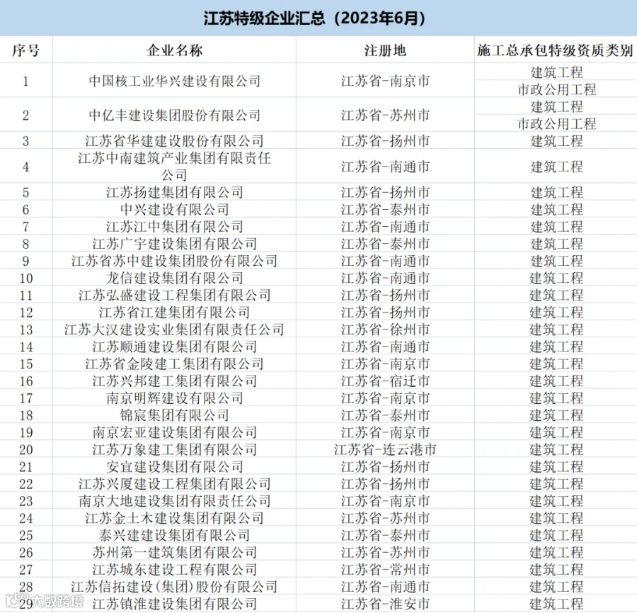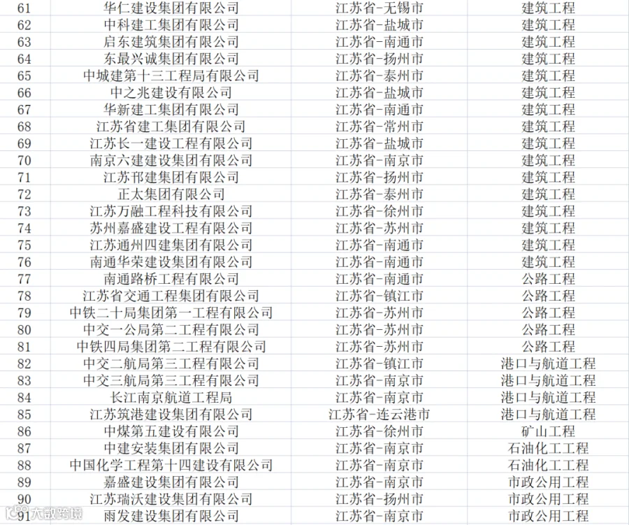 江苏:共有特级企业91家,特级资质93项(建筑工程76项、公路5项、市政5项、港口与航道4项、石油化工2项、矿山1项)。