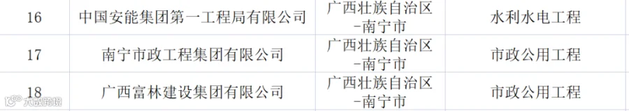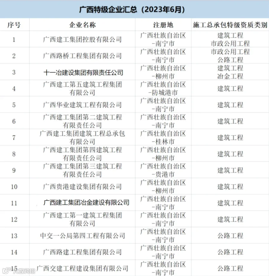 广西:共有特级企业18家,特级资质21项(建筑工程11项、公路4项、市政4项、水利水电1项、冶金1项)。